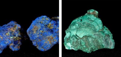 岩絵の具の元になる鉱石、藍銅鉱(群青)、孔雀石(緑青)も展示されていました。なんとも鮮やか。